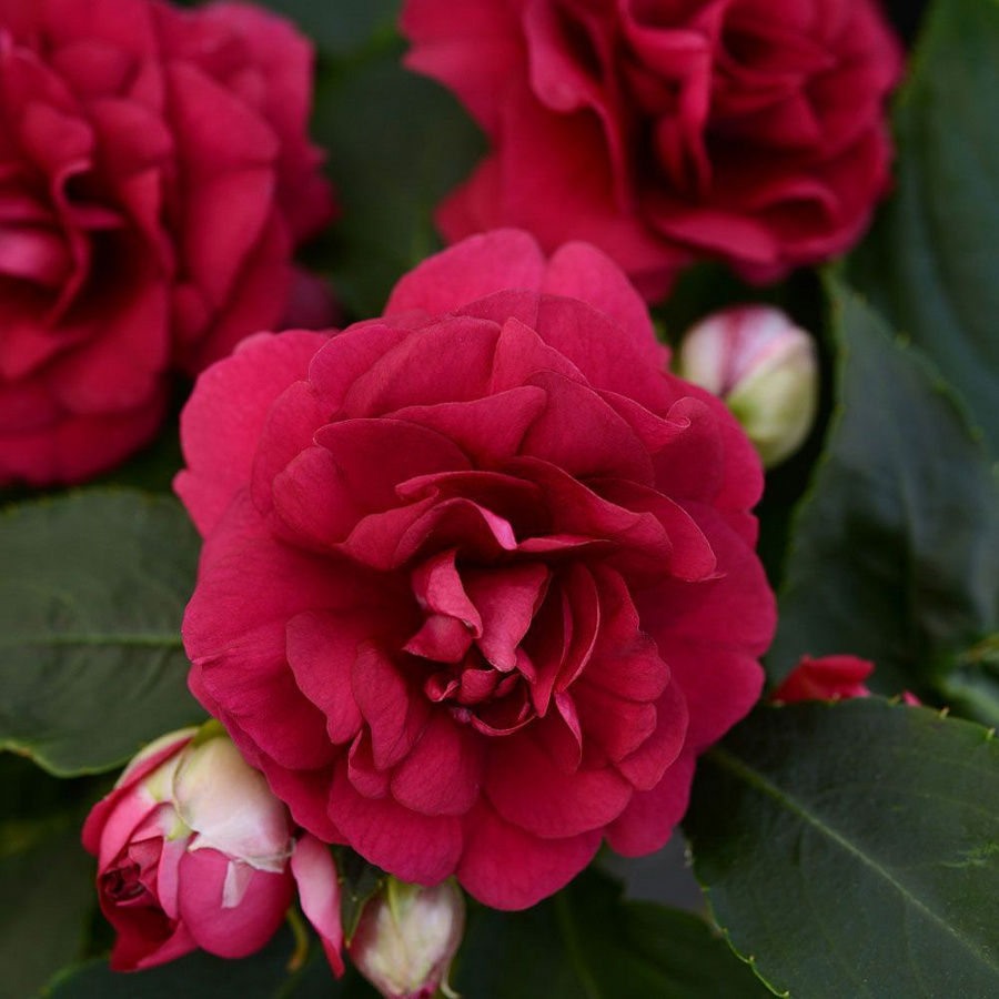 Рассада Бальзамина (Импатиенса) Уоллера Фиеста Бонита Бургунди (Fiesta Bonita Burgundy) образует компактные (не выше 40 сантиметров), хорошо облиственные кустики. Крупная темно-зеленая листва эффектно оттеняет махровые «розочки» насыщенного винно-красного оттенка. Побеги растения довольно длинные, что позволяет выращивать бальзамин как ампельную культуру.