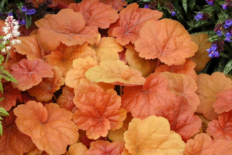 Рассада гейхеры Саузен Комфорт (Southern comfort) обладает крупными листьями, которые имеют персиковый, медный расцвет. К осени листья становятся золотого окраса. Растение небольшое, вырастает до 40 см в высоту, а в диаметре составляет 60 см. Цветет маленькими кремовыми цветами. Плюсы:
