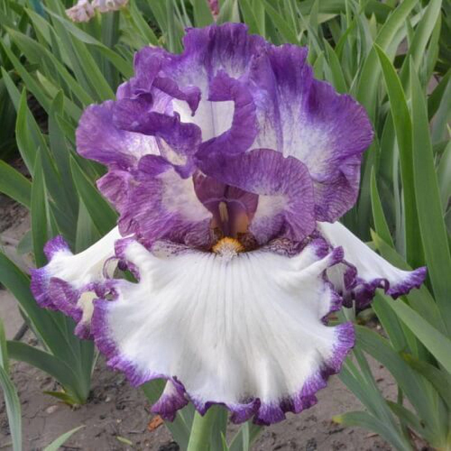 Ирис бородатый "Биг Бразер" - это великолепное растение с изысканными цветками, которые поражают своей красотой и изысканностью. Верхние лепестки фиолетового оттенка с белым пятном в центре, а нижние белые с фиолетовой каймой создают неповторимый образ, который будет радовать глаз в течение всего периода цветения. Листья ириса имеют интересную форму, что делает его еще более привлекательным для любителей необычных растений.