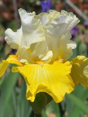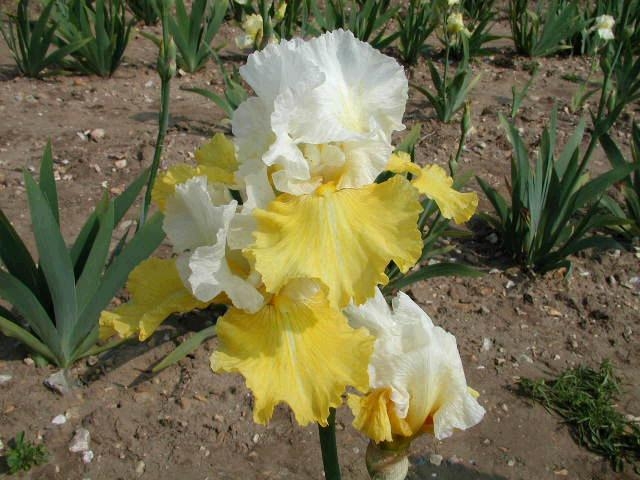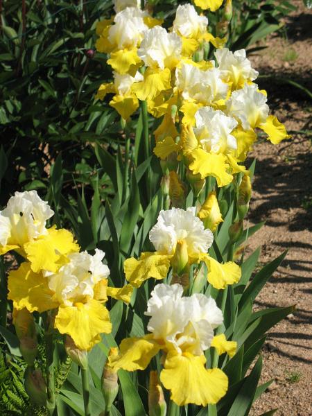 Ирис бородатый эко де франс - это изысканное растение с неповторимой красотой цветков. Верхние лепестки белые с жёлтыми прожилками, а нижние лимонно-жёлтые, создавая удивительный контраст. Высота этого ириса может достигать до 90 см, что делает его заметным акцентом в саду. Листья имеют интересную форму, что добавляет растению изысканности.