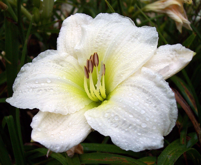 - обильное и продолжительное цветение. Распустившиеся бутоны имеют белоснежные лепестки с немного гофрированным краем и атласным блеском, горлышко при этом нежно-зеленного оттенка. Лилейник Джентл Шеферд прост в уходе, что нисколько не уменьшает красоты этого растения. Взрослый куст имеет обильную листву и множество цветоносов, что создает ароматное цветочное облако.