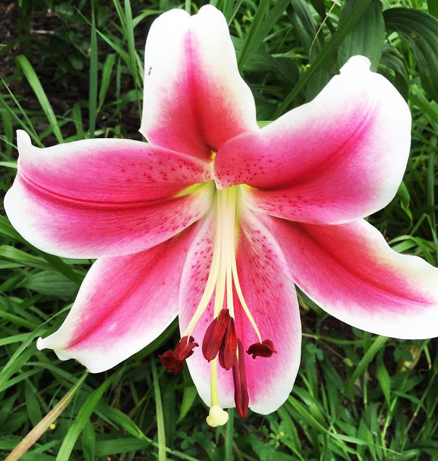 Окраска цветка : цветок розовый с темно-розовой полосой по центру лепестка и белым кантом