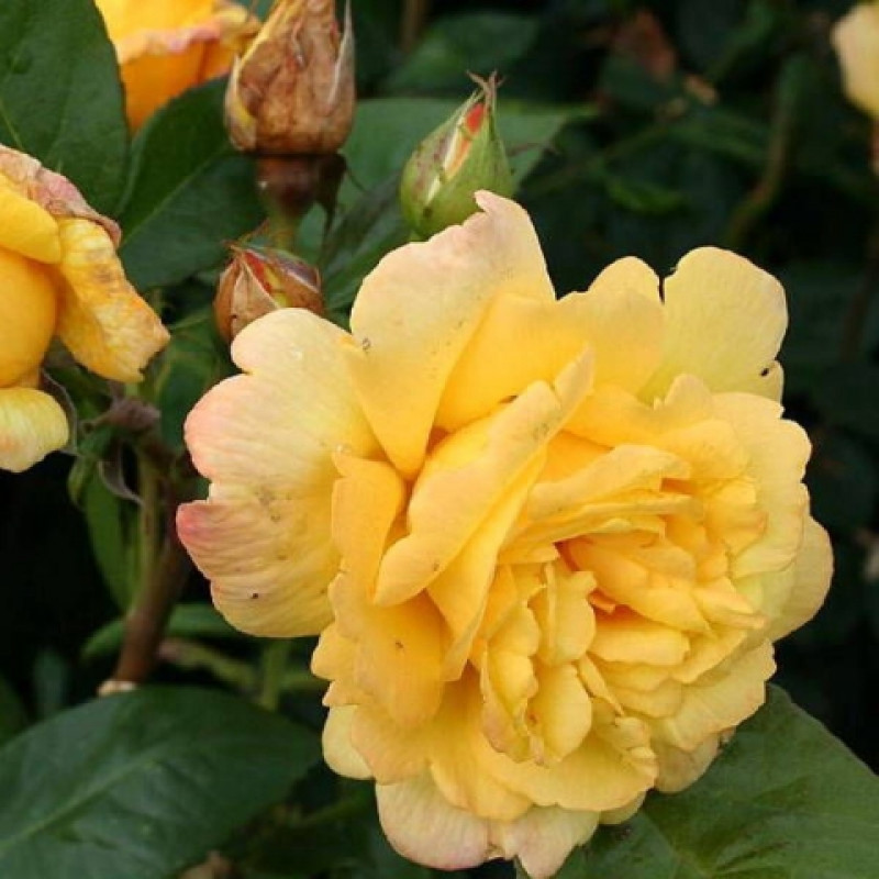Роза парковая Чайнатаун - это великолепное растение с кремово-желтыми цветками, украшенными темно-розовыми штрихами. Ее ствол прочный, а листья имеют изящную форму, что делает эту розу по-настоящему уникальной. Высота растения может достигать 90-110 см, что позволяет создать великолепные групповые посадки в саду или на клумбе.