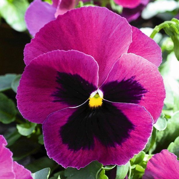 Виола крупноцветковая "Дельта Роуз виз Блотч" - это удивительное растение с пурпурно-черными цветками, размером 8-10 см, которые будут радовать ваш взгляд в июне и июле. Этот сорт отличается высотой до 15 см и предпочитает групповые посадки на солнечных или полутенистых участках с плодородной почвой. Виола обладает зоной морозостойкости 1, что делает ее идеальным выбором для сада или огорода.